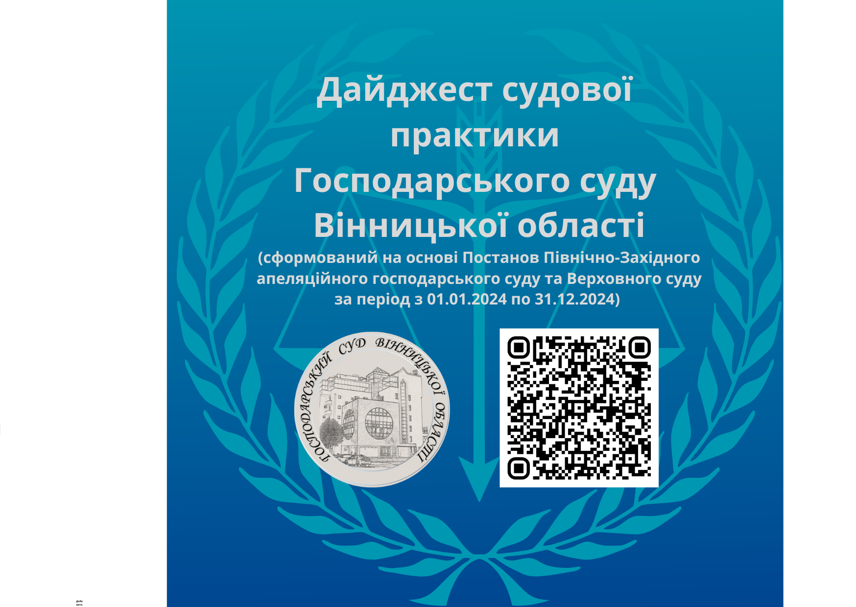 Пропонуємо до вашої уваги дайджест судової практики Господарського суду Вінницької області (сформований на основі Постанов Північно-західного апеляційного господарського суду та Верховного суду за період з 01.01.2024 по 31.12.2024) – Дайджест